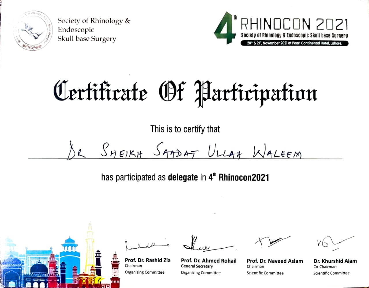 This Certificate of Participation serves as formal recognition for Dr. Sheikh Saadat Ullah Waleem, acknowledging his contribution as a speaker at the 4th Rhinocon 2021 conference. The event was hosted by the Society of Rhinology & Endoscopic Skull base Surgery