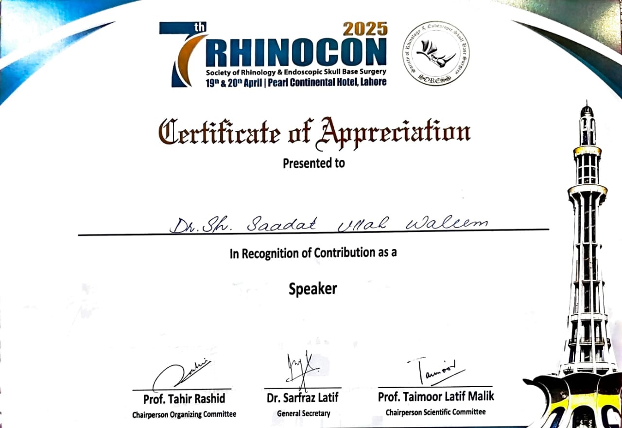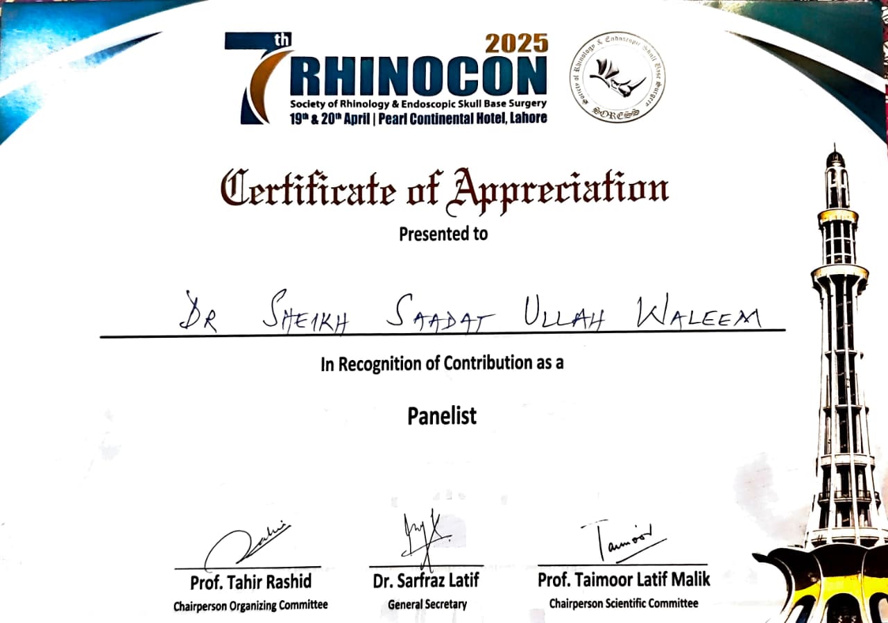 This Certificate of Appreciation recognizes Dr. Sheikh Saadat Ullah Waleem for his valuable contribution as a Panelist during the 7th Rhinocon 2025. This event is the flagship annual conference of the Society of Rhinology & Endoscopic Skull Base Surgery (SORESS).
