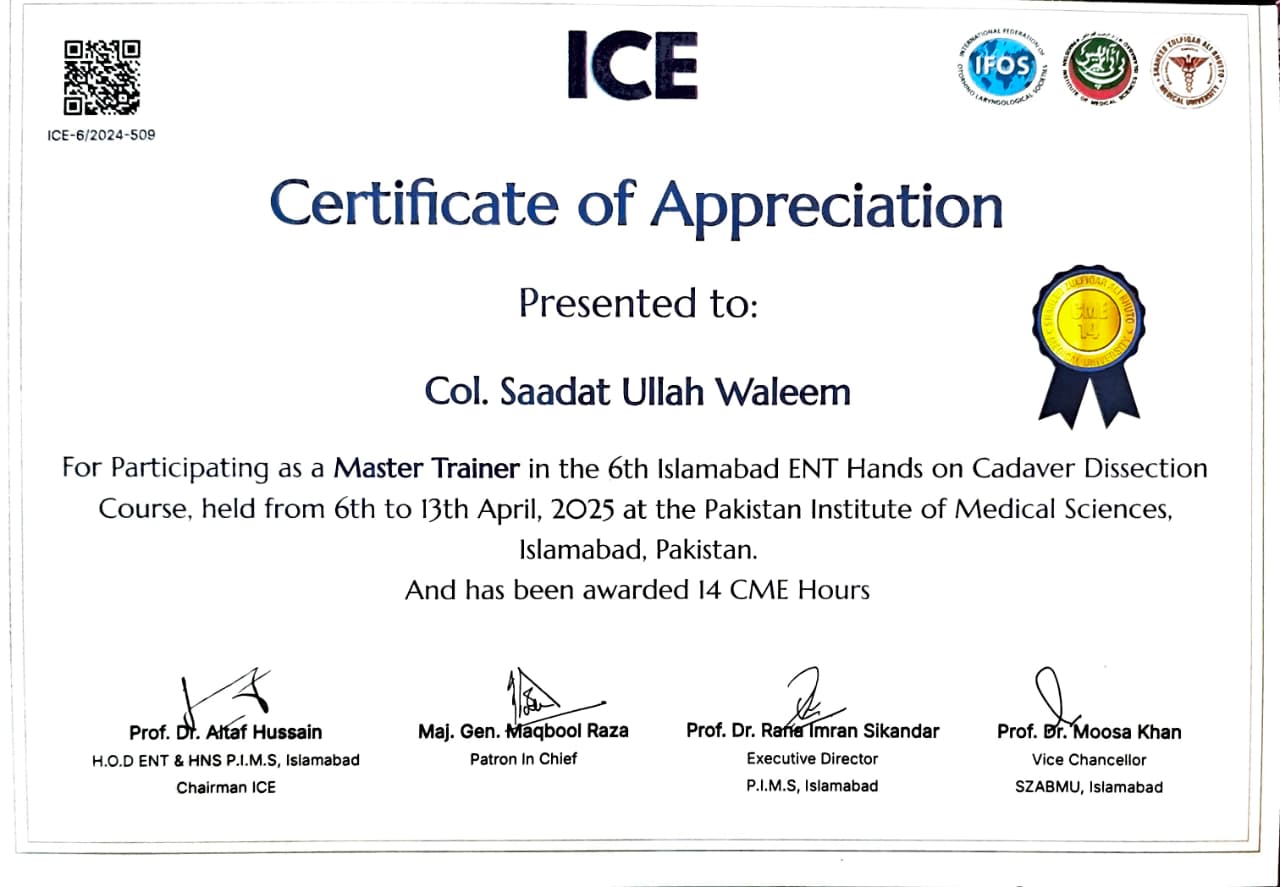 This document is a formal Certificate of Appreciation awarded to Col. Saadat Ullah Waleem in recognition of his role as a Master Trainer. The certificate commemorates his participation and instructional contribution to the 7th Islamabad ENT Hands-on Cadaver Dissection Course.
