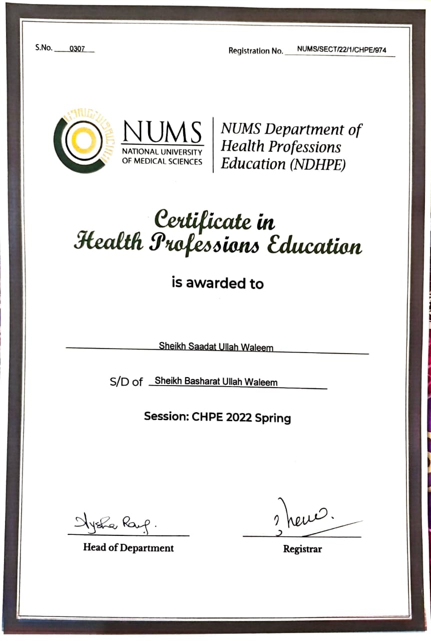 This is the formal Certificate in Health Professions Education (CHPE) awarded to Sheikh Saadat Ullah Waleem by the National University of Medical Sciences (NUMS).